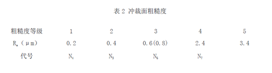 沖裁面的粗糙度用算術平均值aR 表示。其值一般Ra=0.2~3.6,共分為六個等級(見表2),